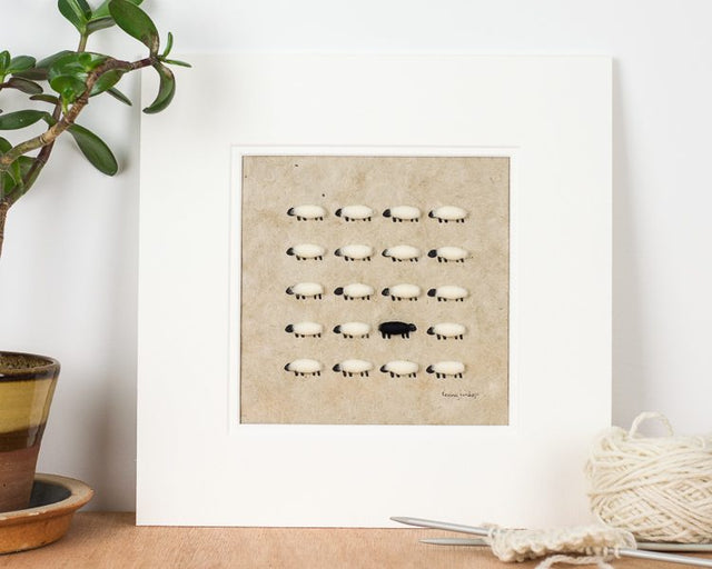 One of our most popular designs, this print features 5 rows of white sheep and a single black sheep facing a different direction - perfect for the person who takes an alternative path. It is printed on a sustainable, textured, light brown paper hand made in the Himalayan Mountains.